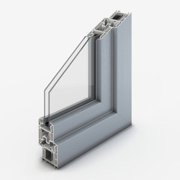 Profilo anta sezione 76x58 mm, a 5 camere, con rinforzi in acciaio di spessore 20/10 mm. Profilo esterno in alluminio con funzione di cornice perimetrale fermavetro, assemblato ad incastro con il corpo principale in PVC. Biadesivo di tenuta strutturale, interno ed esterno.